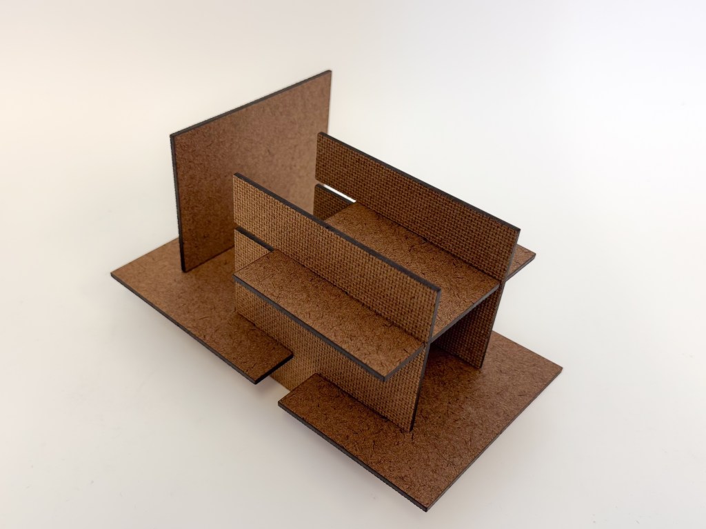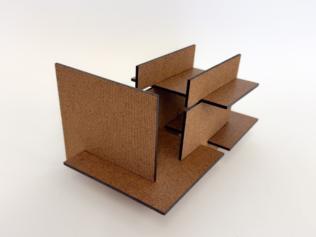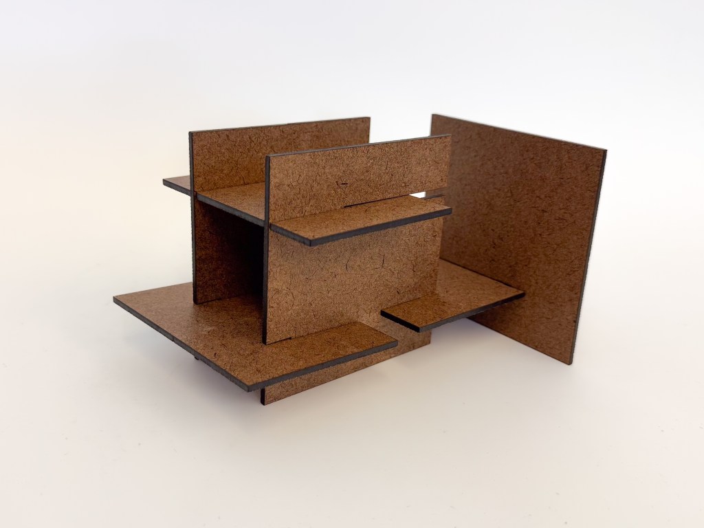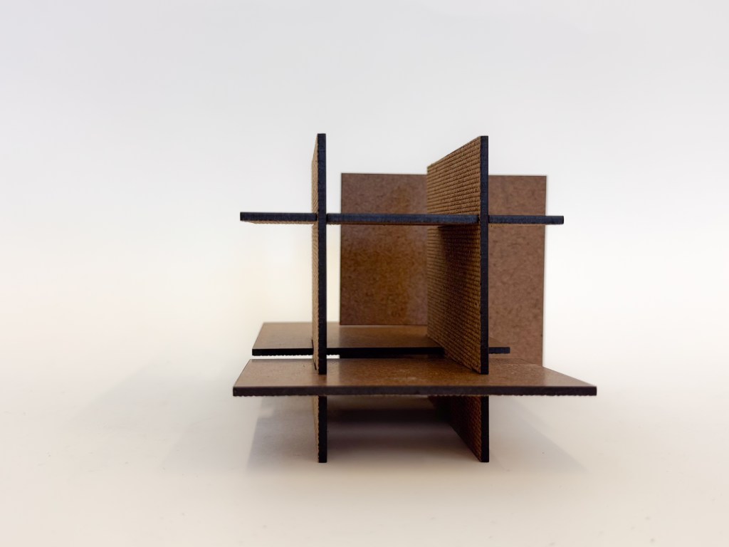 View from facing what could be considered the front of the object. To the right is a large partial-wall that does not span the entire width of the object. Lines seem like they continue through, at first glance, but they are broken, allowing the object to be dynamic.
