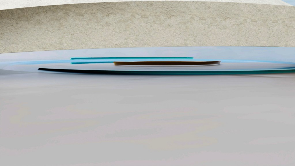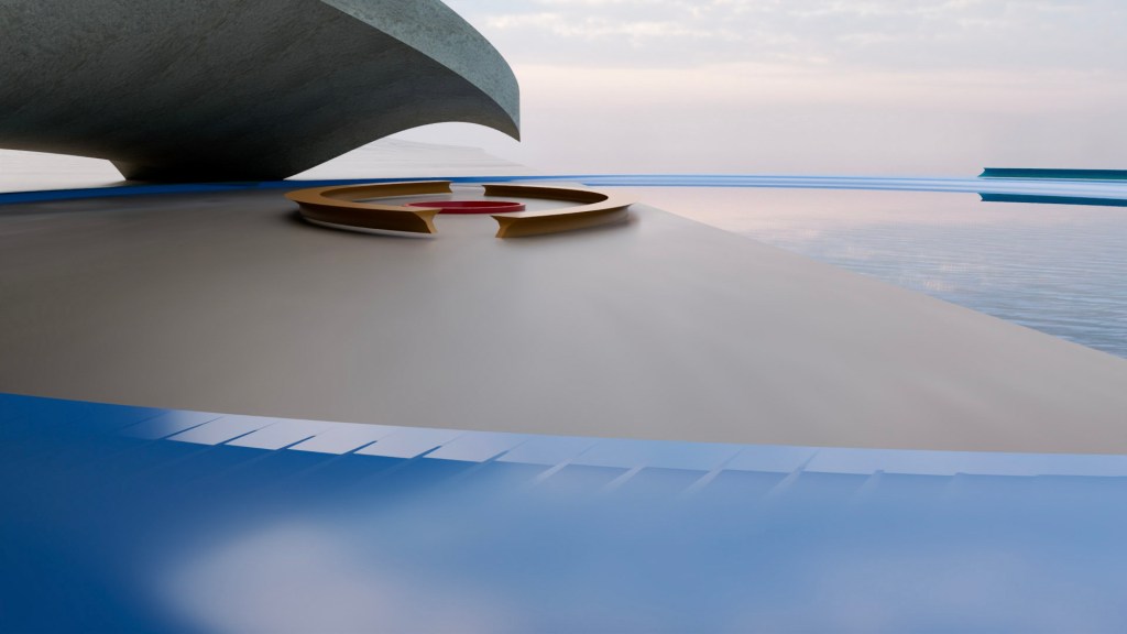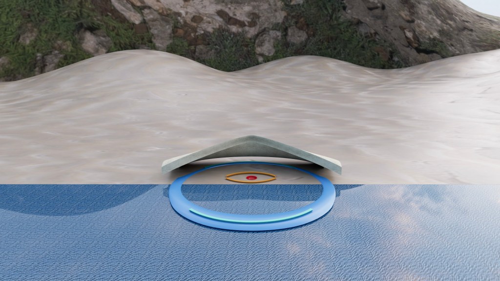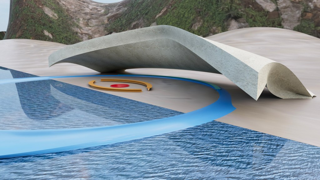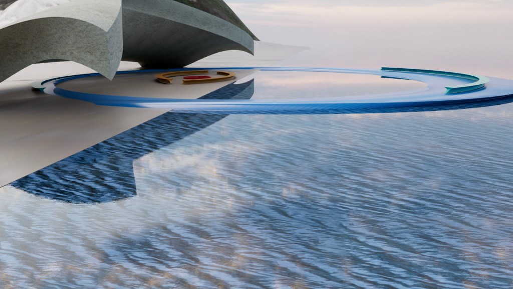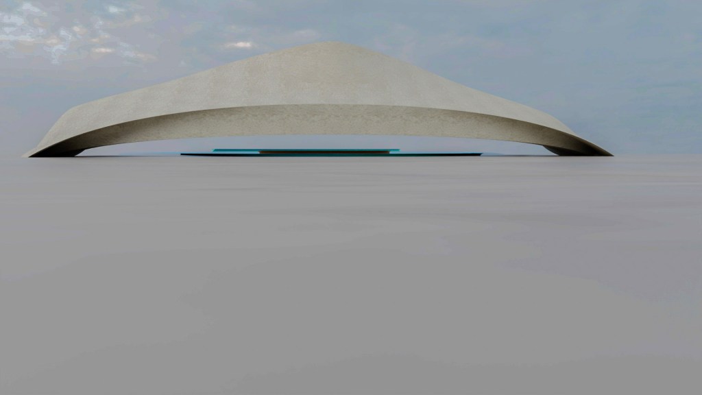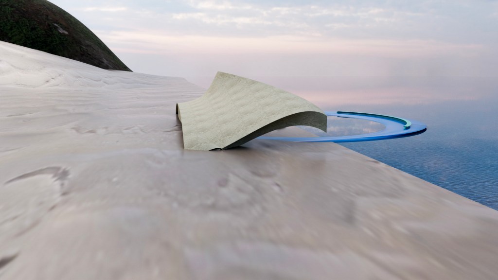 This structure complements the space it occupies. The base that extends over the water would be of a near clear or nearly translucent heavy blue material. The benches on the arc over the water and under the pavilion itself are mirroring each other and of the same material and color. The pavilion itself speaks to cloud and sand, earth and air. The center on the beach houses a fire pit with benches surrounding that mirror each other. It is understood that the terrain will shift, ebb and flow over time as beach and sand is not fixed.